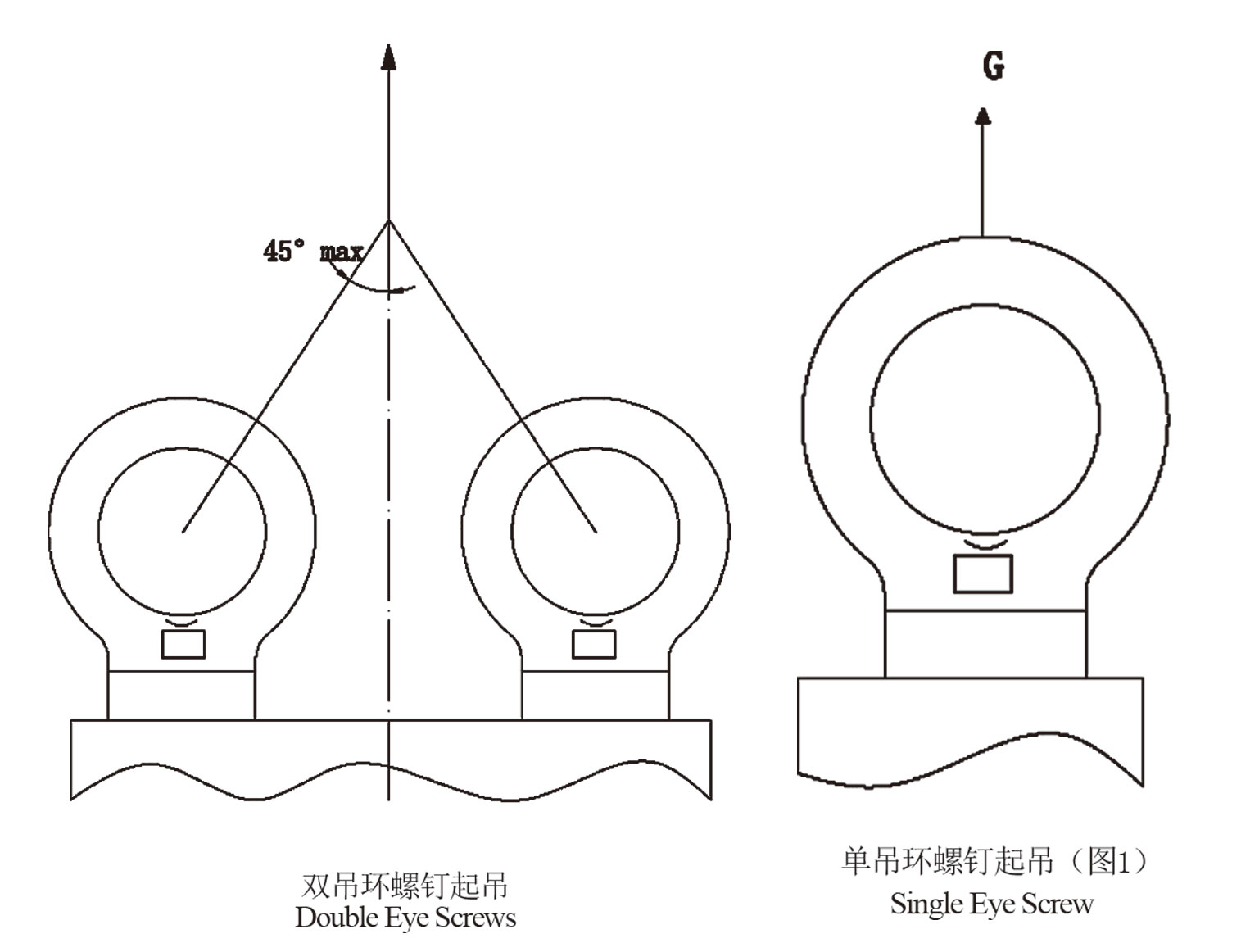 3.当采用“双螺钉起吊”(如下图)方式时,应保证两吊环在同一平面内,为此可在支撑面上加放调整垫片,配套锁具的夹角不应大于90度,且每只吊环螺钉的最大起重量应该按额定载荷的1/2计算。