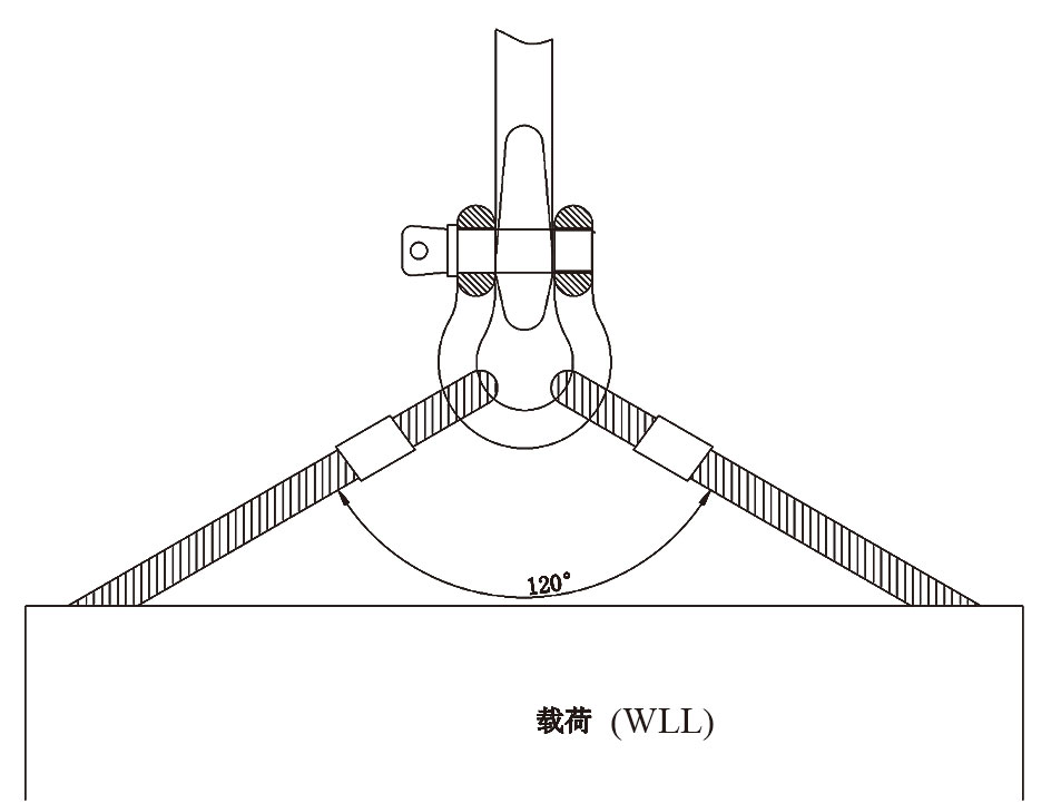 7.卸扣承载的两腿索具间的夹角不得大于120度(如下图)。