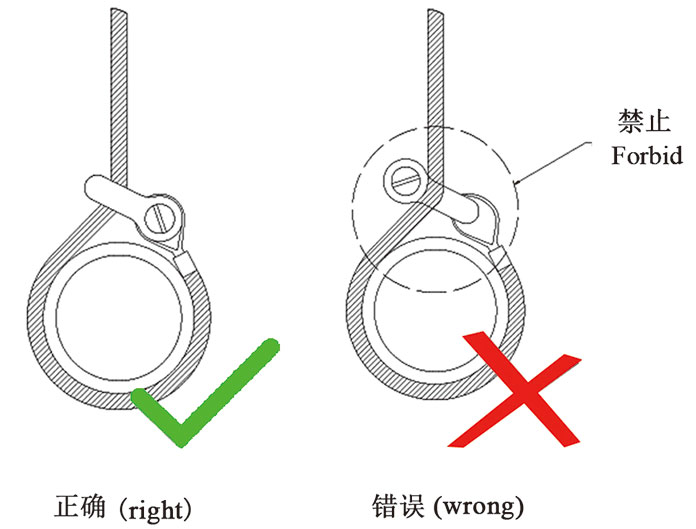 1.使用吊钩时,应将索具顶端部件挂入吊钩受力中心位置,不能直接挂入吊钩钩尖部位,如图: