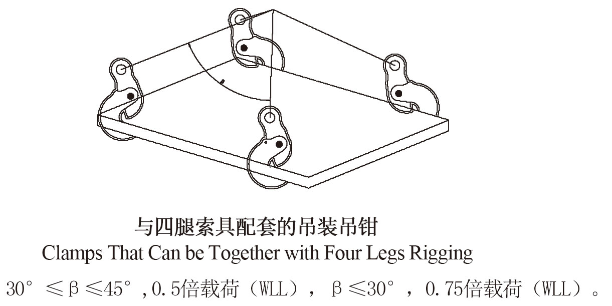 1.当双肢索具连接竖钳起吊同一块钢板时,有万向吊环式的顶角不超过60度,无万向吊环式的顶角不超过30度,而且两只吊钳的大起重载荷不得超过单肢的1.5倍。