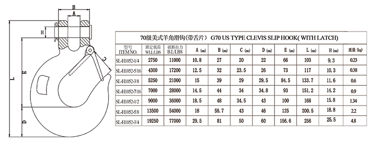 1、特点:高强度优质合金钢模锻。 2、适用于和70级索具配件配合使用。 3、制造检测拉力为额定载荷的2倍。以额定载荷的1.5倍,抽样做20000次的循环疲劳检测。 4、100%进行磁粉探伤。